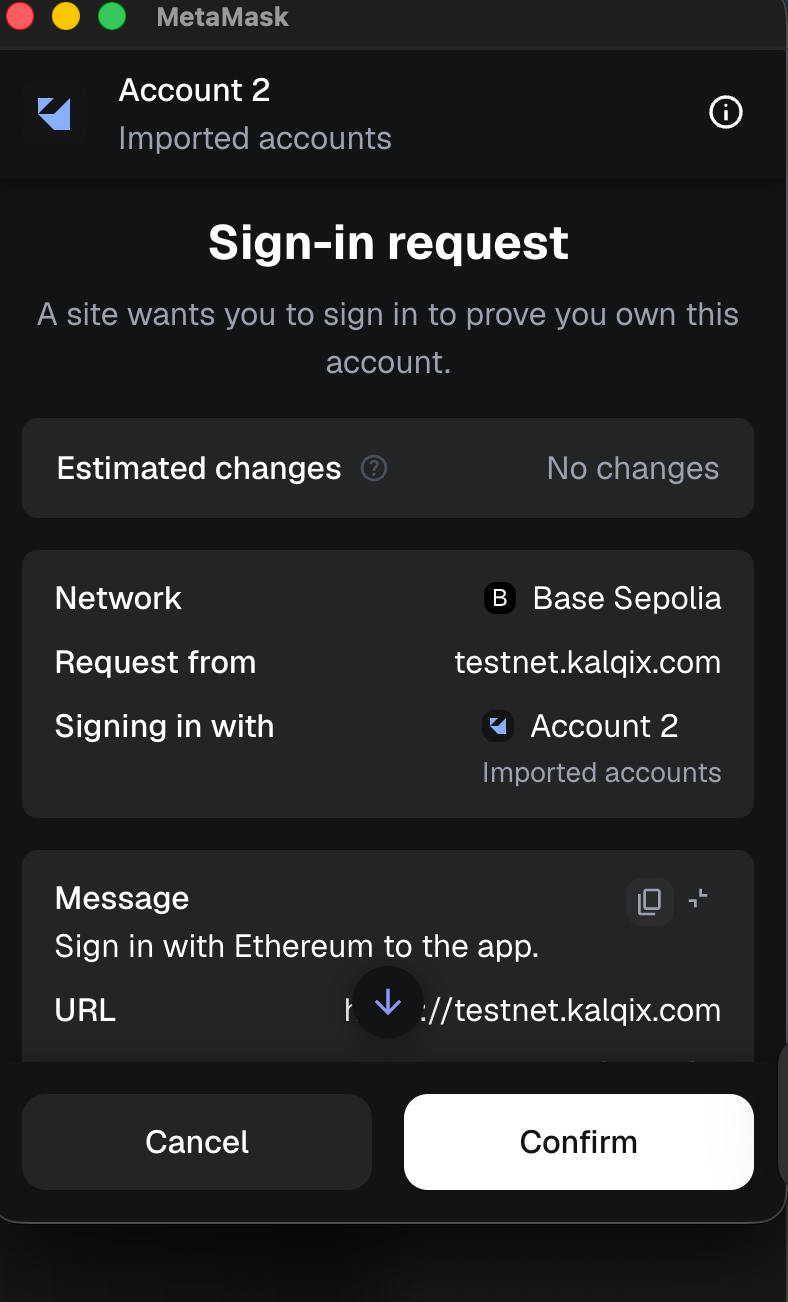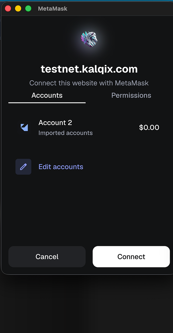 You’ll be asked to sign a transaction to connect your wallet securely with KalqiX.